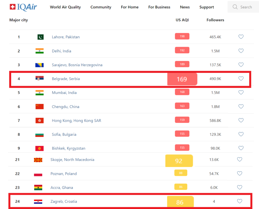 Zabrinjava činjenica da se Beograd samo u ovoj godini više desetina puta pozicionirao na samom čelu liste najzagađenijih gradova na svetu, jer to znači da građani svakodnevno udišu sve opasniji vazduh, što prema procenama stručnjaka kao posledicu ima preranu smrt od preko 10 hiljada ljudi godišnje zbog respiratornih problema.